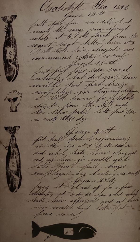 The Weather and the Whale exhibition includes two logbook stamps (pictured below) hand carved out of wood. The one of the left, which is shaped like a sperm whale, would have been used to indicate that a whale was successfully caught; the one on the right, which only shows a fluke—the raised tail of a diving whale—would have been used to indicate a failed pursuit.